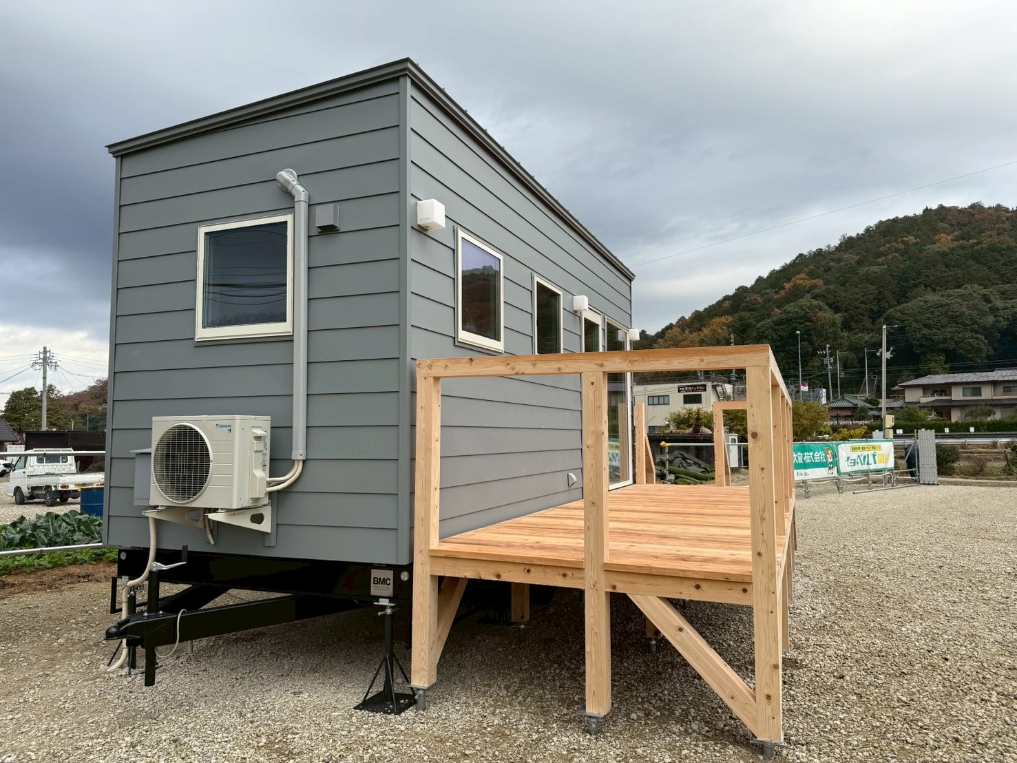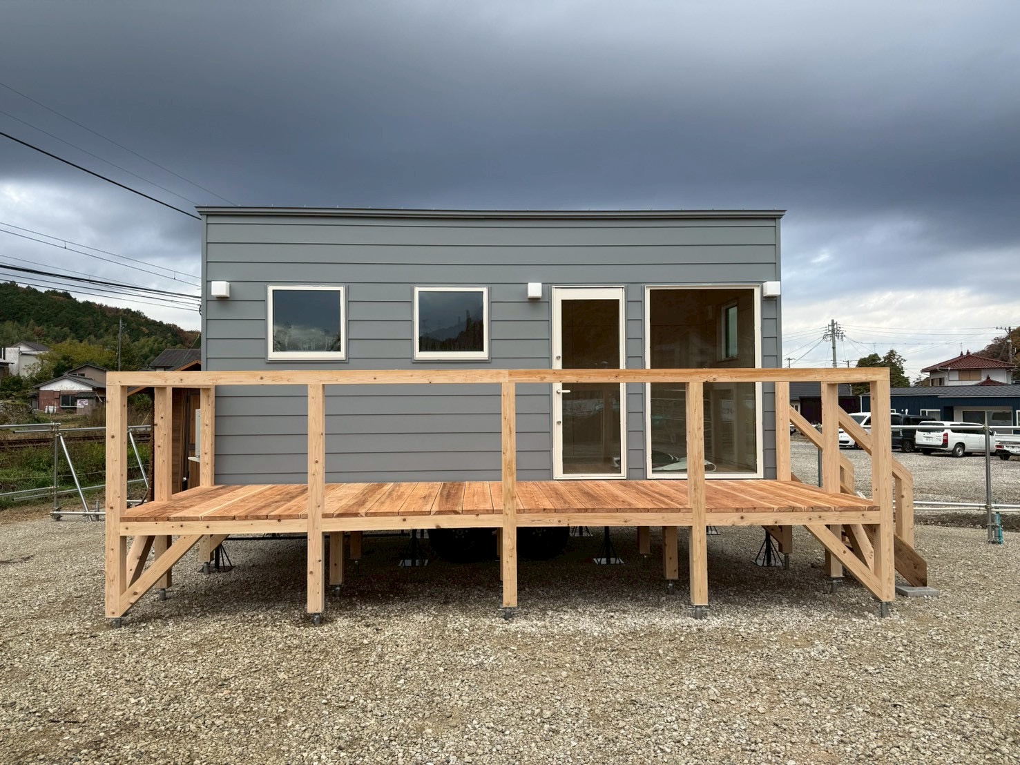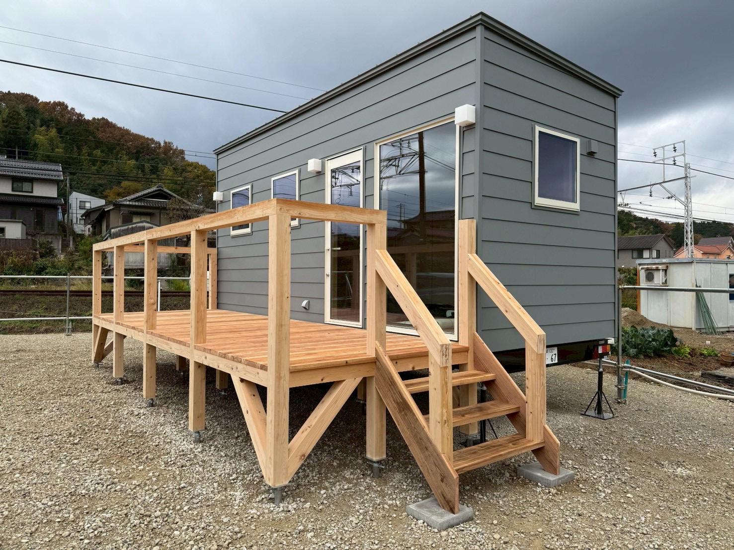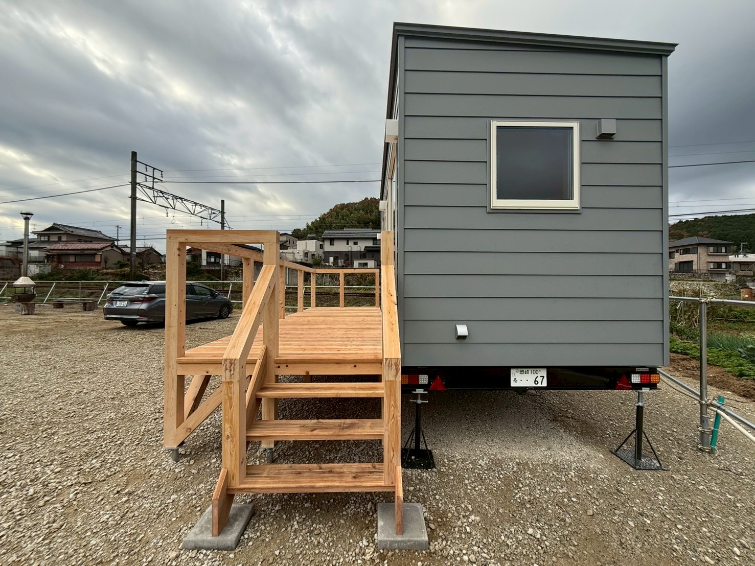 先日、納車させていただいた、藤川町のトレーラーハウスにウッドデッキを設置しました。