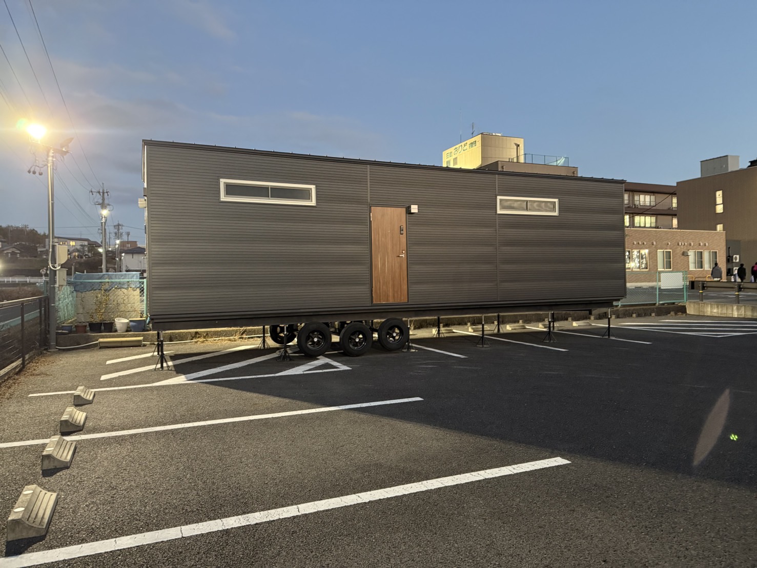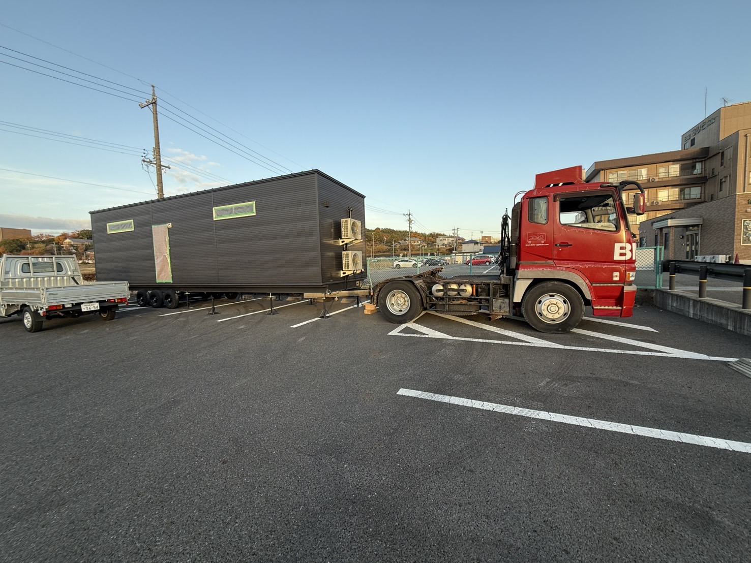 一見、広そうな場所に見えますが、牽引車でバック駐車しながら敷地にできるだけ寄せて駐車するのはなかなかの技術が必要です。なんとか日が暮れるころ、無事設置完了の連絡がきて一安心しました。
