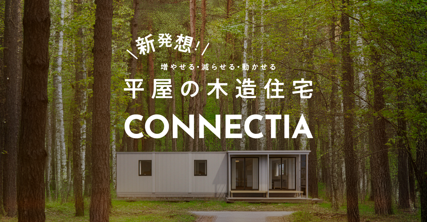 • CONNECTIA(コネクティア)はユニットハウスです。移動ができる、木造軸組工法の平屋で、一定の場所にとらわれない住宅です。そして、それだけではありません。